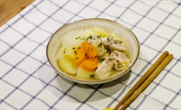 Step3 Step2に鶏肉を加えて更に約7分程煮込み、鶏肉に火が通ったら塩こしょうを振り味を整え、パセリを散らせば出来上がり。