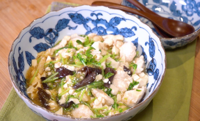 | Step4 | 鍋に鶏ガラスープと水を入れて加熱し、沸いたらStep1とStep2、豆腐を崩しながら加えます。 |
