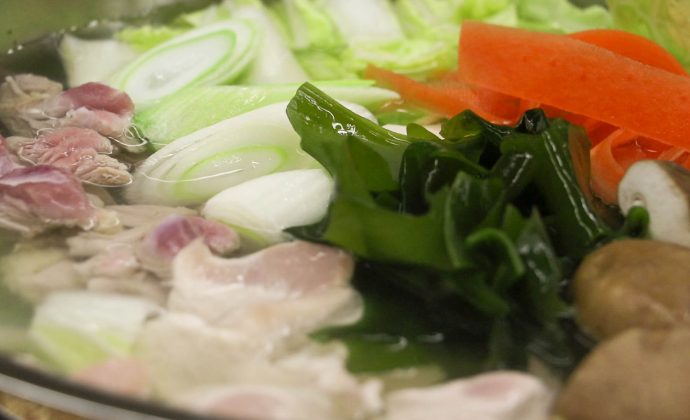 | Step2 | 鍋の8分目位まで水(分量外)を注ぎ入れてから白菜の芯の部分を入れ、中火でひと煮立ちさせます。 人参、椎茸、長ねぎ、鶏肉の順番で鍋に入れて火を通します。わかめは最後に鍋に入れ、温める程度に加熱します。 |
