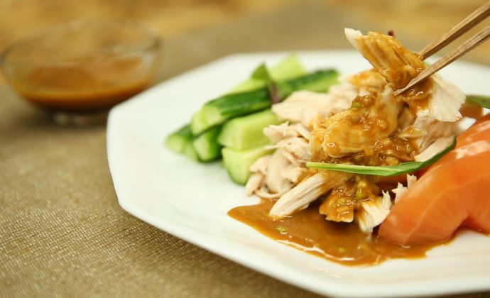 | Step5 | ほぐしたむね肉と付け合わせのカット野菜を盛り付けて、タレをかければ出来上がり! |