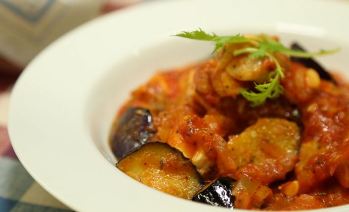 | Step7 | ソースの味が良い加減になってきたら、ドライバジルと素揚げの茄子を加えて軽く煮込んで器に取り分けます。 |