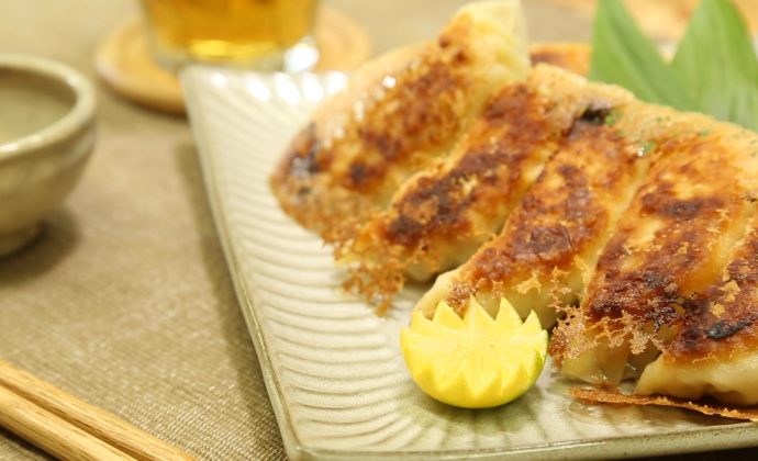 包丁で叩いた鶏肉にレンコンを加えてさらに食感をUP! 羽根つき餃子を召し上がれ